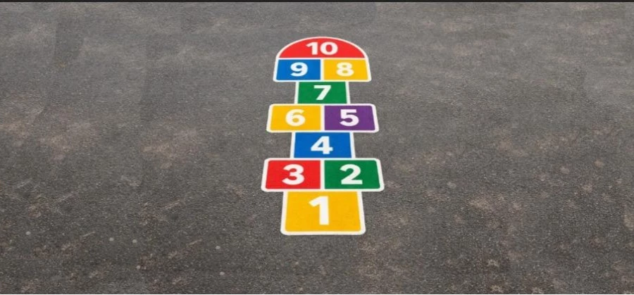Traditional playground markings commonly include hopscotch, skipping grids, playground courts, target games, and movement trails.